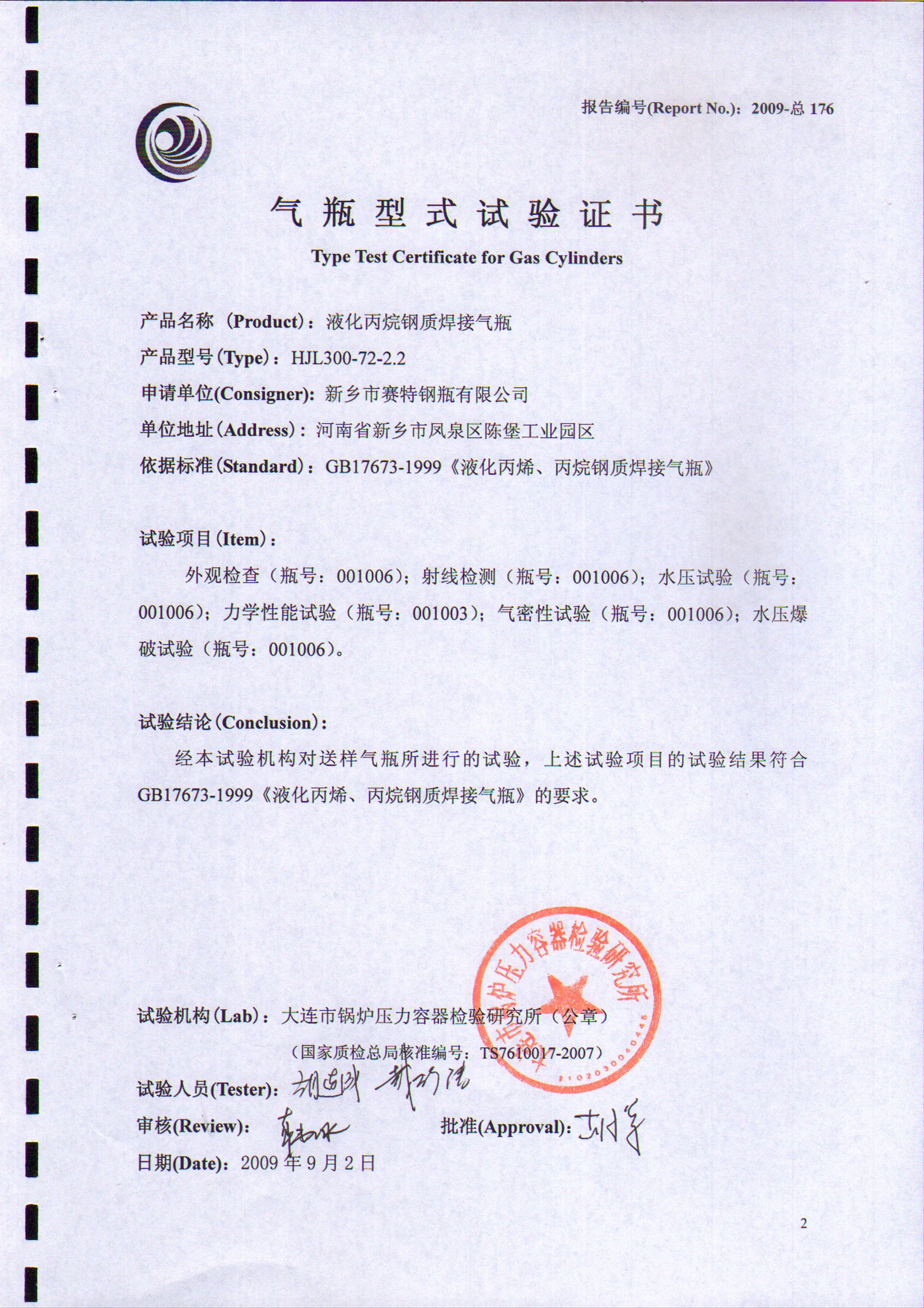 HJLII300-72-2.2T液化丙烷鋼瓶型式試驗證書