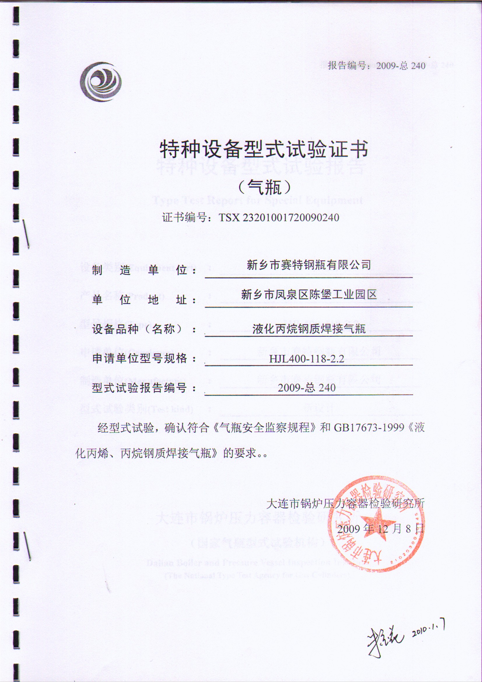 HJLII400-118-2.2T液化丙烷鋼瓶型式試驗證書